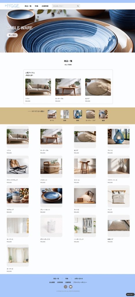 シンプルで拡張性があり、家具を探しやすい商品一覧ページを制作すること。